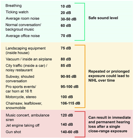- US Centers for Disease Control and Prevention. Noise-induced Hearing Loss. Available online: https://www.nidcd.nih.gov/health/noise-induced-hearing-loss (accessed on 28 November 2022).