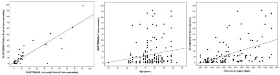 Correlation between horizontal and vertical glistening (left), severity of the glistening and age (center) and severity of the glistening and time since surgery (right).