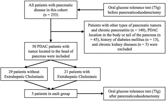In this prospective cross-sectional study, from August 2017 to June 2018, 253 patients with pancreatic diseases were screened for abnormalities in glucose metabolism before pancreatic surgery. We excluded 140 patients diagnosed with other types of pancreatic tumor and chronic pancreatitis, 45 PDAC patients with tumors located in the body or tail of the pancreas, 13 patients with a history of diabetes mellitus, and 5 patients with chronic kidney diseases. The remaining 50 patients with ductal adenocarcinoma of the pancreatic head were included for further analysis (Figure 1). All patients had normal kidney function, as determined by medical history, estimated glomerular filtration rate, and urinalysis. Extrahepatic cholestasis was diagnosed by imaging, suggesting an enlarged common bile duct due to the pancreatic head mass, total bilirubin level greater than 34.2 μmol/L, and direct bilirubin mainly increased. Accordingly, patients were classified into the extrahepatic cholestasis and no extrahepatic cholestasis groups. The duration of the patients with cholestasis ranged from one to four weeks. The tumor stage of PDAC patients was classified according to the 8th Edition American Joint Committee on Cancer staging system [16]. The diameter of the tumors and the dilation of the main pancreatic duct (MPD) were also recorded based on the CT images and the Intraoperative findings. This study was approved by the Biomedical Research Ethics Committee in our hospital (2014 Trail No.37) and complied with the terms of the Helsinki Declaration. Informed consent was obtained from all individual participants and/or legal guardians enrolled in the study.