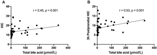 Correlation between bile acid levels and (A) HIC and (B) 3 h postprandial HIC. HIC, hepatic insulin clearance.