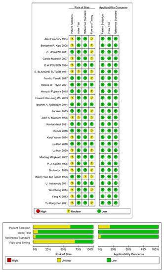 The quality of the literature was evaluated using the Cochrane risk of bias tool [20,21]. Two reviewers independently screened the literature, extracted the data, and evaluated the quality of the literature according to the inclusion and exclusion criteria. Quality assessment of four studies (15.4%) showed a ‘low’ risk of bias for all four items (not shown), while the other 22 studies had an “unclear” risk of bias in at least one criterion in the description of methods for patient selection, index, reference test, flow, and timing. All studies scored “low” on the three items of applicability. The results of the evaluation of literature quality are shown in Figure 2. After the study selection and quality assessment, 26 articles were included in a systematic review. The basic characteristics of the included studies are shown in Table 1.