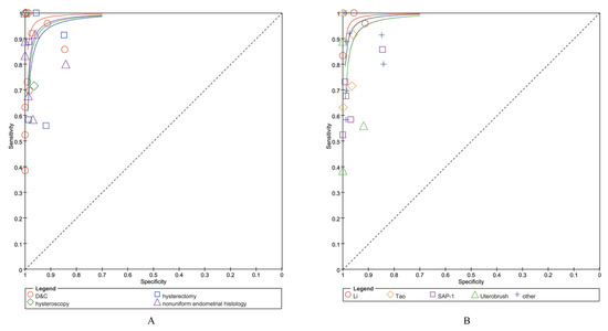 SROC (summary receiver operating curve) plot ((A) with different reference standards; (B) with different cytologic sampling methods).