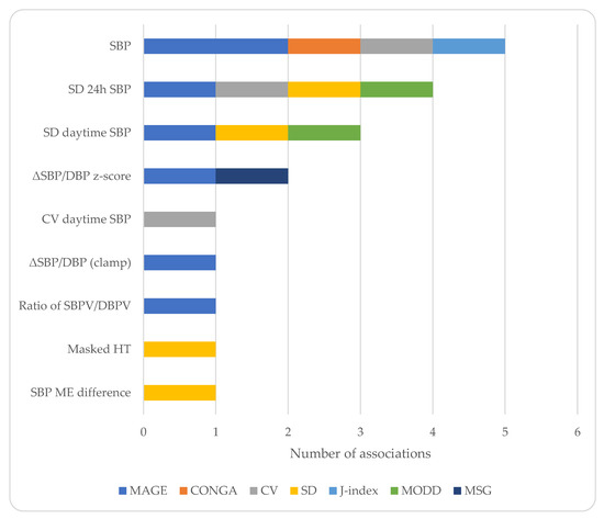 There was also a high degree of heterogeneity regarding the indices reported (Figure 1) and the type of associations between the GV and BP parameters examined (Table 3). The most commonly studied index of GV was MAGE [20,21,22,23,25,27,32], as well as the SD of glucose [23,30,31,32], while for BP parameters, average levels [20,22,23,24,26,28], SD [32], and dipping status were studied [27]. A few studies reported positive associations between GV indices and average BP levels [22,24,26]. Two studies reported associations between the indices of GV and BPV [24,32], and one study reported that an increased GV determined the presence of masked hypertension [31]. Other studies did not report associations [23,27] and one study reported an inverse correlation between MAGE and the indices of BPV [25].