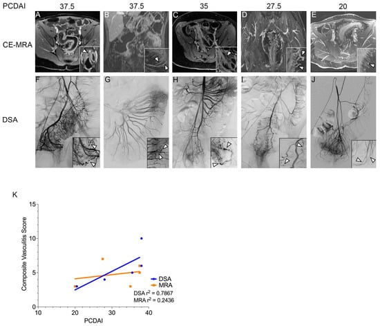 Vascular imaging of pediatric patients with Crohn’s disease. Contrast-enhanced magnetic resonance angiography (CE-MRA) (A–E) and digital subtraction angiography (DSA) (F–J). (A–E) show representative axial or coronal CE-MRA images. Arrowheads denote areas of altered vascular morphology including tortuosity (Panel (C,F) inset arrowheads), stenoses (Panel (D,G) inset arrowheads), and beading (Panel (H) inset arrowheads). Panel (J) inset arrows show angiogenesis seen in a relatively quiescent region of the bowel but without altered vascular morphology. Panel (K) shows linear regressions for vasculitis scores; MRA and DSA images were independently scored by two diagnostic radiologists who were blinded to the patient’s PCDAI score. Differences were resolved by consensus. Each image was assessed on a 0–5 scale of vascular tortuosity, beading, occlusion, and stricture; the composite score was generated as a sum of these four categories.