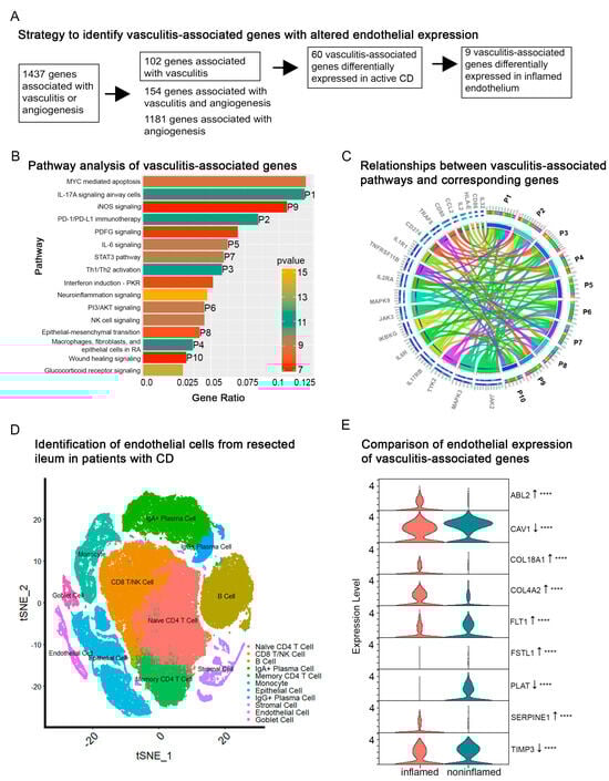 Transcriptomic and single-cell analysis of vasculitis and angiogenesis pathways in Crohn’s disease. Panel (A) shows the significant (p-value < 0.05) pathways identified among the 60 vasculitis-associated genes that were differentially expressed in patients with active CD. Panel (B) depicts the core pathway analysis which was performed using the Ingenuity Pathway Analysis (IPA) database. X-axis denotes the Gene Ratio (number of genes identified in our screen compared to the total number of background genes associated with the pathway) for each pathway; color-coding depicts the significance of each pathway based on its p-value. Panel (C) depicts a Circos plot showing the relationship between enriched vasculitis-associated pathways and their corresponding genes identified in our screen. Clockwise from top: pathways and genes are ordered by their number of interactions. Ribbon size encodes cell value associated with row/column segment pair. Column segment value and ribbon color are decided by the number of interactions but are not indicative of statistical significance. Panel (D) shows a t-distributed stochastic neighbor embedding (t-SNE) plot depicting immune and non-immune subsets of cells in 10 patients who had intestinal resection for active CD. We identified a cluster of CD31 (PECAM−1)-positive cells which were designated as endothelial cells. Panel (E) shows the relative endothelial expression level of nine genes that were significantly differentially expressed between inflamed and noninflamed areas of patients who underwent bowel resection for active CD. Arrows indicate the direction of altered expression. **** indicates p < 0.001.