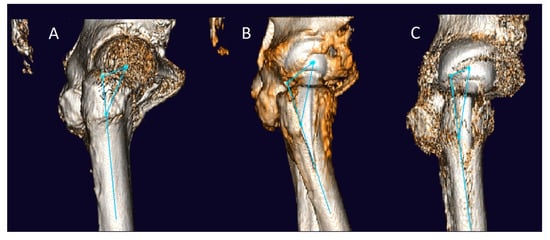 Preoperative and postoperative CT measurement method. 3D measurements obtained with mediCAD hip 3D software, showing the proximal femoral long axis defined by two points and the femoral anteversion angle formed between a perpendicular line through the proximal femoral long axis and the femoral head, and a line connecting the femoral condyles. (A): preoperative condition. (B): postoperative condition with short stem. (C): postoperative condition with straight stem.
