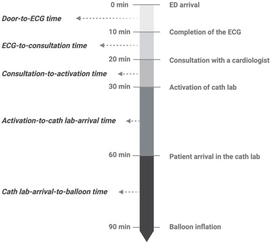 For outcome measurement, ECG time, cardiologist consultation time, cardiac catheterization laboratory (cath lab) activation time, the time the patient arrived at the cath lab, and balloon inflation time were obtained. We defined DTB time as the time from ED arrival to balloon inflation, door-to-ECG time as the time from ED arrival to completion of the first ECG, the ECG-to-consultation time as the time from completion of the first ECG to consultation with a cardiologist, the consultation-to-activation time as the time from cardiologist consultation to activation of the cath lab, the activation-to-cath lab-arrival time as the time from activation of the cath lab to the patient’s arrival in the cath lab, and the cath lab-arrival-to-balloon time as the time from the patient’s arrival in the cath lab to balloon inflation (Figure 1) [,,,,,,]. This study was approved by the Institutional Review Board of the Ditmanson Medical Foundation Chia-Yi Christian Hospital (CYCH-IRB 2022016).