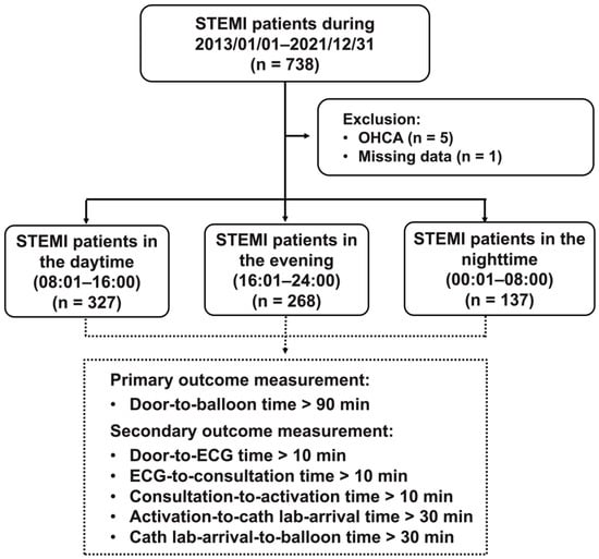 During the study period, 738 STEMI patients were identified. Five OHCA patients and one patient with incomplete data were excluded. A total of 732 patients were included in this study. A total of 327 patients arrived during the daytime (08:01–16:00), 268 in the evening (16:01–24:00), and 137 at night (00:01–08:00) (Figure 2).