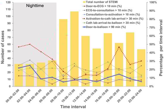 Temporal variations in the number of STEMI incidents and the percentage of measured outcomes at 2-h intervals throughout the day. ECG—electrocardiogram; STEMI—ST-segment elevation myocardial infarction.