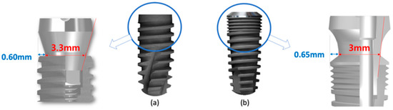 The study used two different implant systems from the same manufacturer. Both implants had the same surface topographies. One had a platform-switching design with microthreads at the implant neck (IT; Warantec, Seoul, South Korea). The implant–abutment connection had a 7° angle to the long axis. The other had a platform-switching design without microthreads and an 11° internal taper angle (IU, Warantec) (Figure 1).