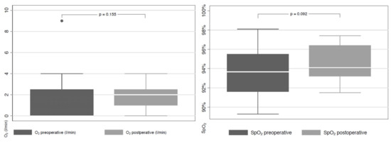 The mean respiratory rates before and after the intervention were 20 ± 3 BPM and 20 ± 4 BPM, respectively. The median SpO2 remained at 94% (no statistical difference, p = 0.09), whilst the median oxygen supply did not increase significantly from 0 L/min to 2 L/min) (p = 0.10) within three days after bronchoscopy (Figure 2). Eleven patients had to increase their oxygen supply for one day after bronchoscopy, although they had no need for exogenous oxygen supply. Seven patients who already needed oxygen before bronchoscopy were able to reduce their oxygen supply.