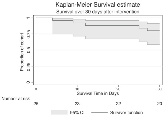 Kaplan–Meier survival estimate. Thirty-day survival was observed in 20 patients (79.1% [95% CI 58.4–91.1%]).