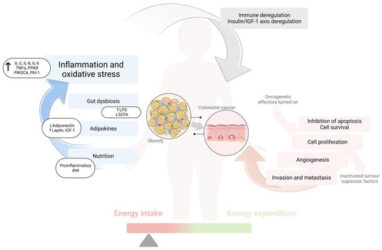 Further, upregulated secretion of adipokines (e.g., leptin or adiponectin), interleukins (e.g., IL-1, IL-6, IL-12), and proinflammatory cytokines (e.g., THF-α) are associated with low-grade inflammation, contributing to CRC. Several adipokines have been linked to CRC development by affecting signaling pathways (metabolic, inflammatory, and cell cycle) pathways. For example, in in vitro studies, leptin has been found to be an important factor for CRC development in obesity, and it should be noted that serum leptin concentrations can be as much as five times higher among individuals with obesity versus those in normal-weight individuals. Among individuals with obesity, the expression of leptin is altered, leading to increased leptin concentrations—and leptin resistance—and impaired binding to leptin receptors (binding leptin to its receptors inhibits food intake and increases energy expenditure) [75]. Although the exact mechanisms are not fully understood, it is assumed that decreased transport of leptin through the blood–brain barrier is the main cause of leptin resistance [76]. Leptin activates Src kinase and PI3K in the CRC cells LS174T and HM7, inducing activation of Rac1 and Cdc43, promoting carcinogenesis and metastasis [77]. In a study by Endo et al. increased proliferative activity of colonic cells (murine) was observed in the obesity model, and, moreover, increased expression of leptin receptors was observed in colorectal tumors [78]. On the other hand, in decreased leptin concentration conditions (leptin-deficient tumors), a decrease in tumor cell proliferation and tumor growth was observed. However, in vivo studies do not always confirm these results, possibly because of several other interactions with other cytokines or hormones in real-life conditions. For example, in the animal model study of Aparicio et al., hyperleptinemia did not induce variation in tumor volume or weight and did not modify the number, size, or distribution of intestinal adenomas [79].