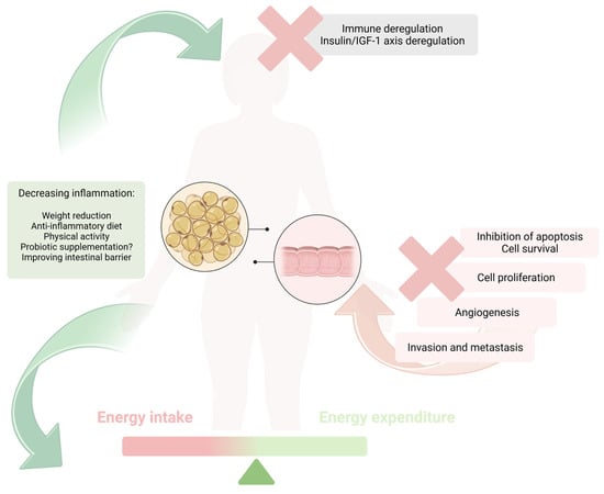Obesity is associated with low-grade inflammation, an unfavorable adipokine profile, macrophage recruitment, and oxidative stress, increasing the risk of colorectal cancer (Figure 1). However, as we have discussed in our paper, many other obesity-related factors, e.g., an unhealthy diet and gut microbiota dysbiosis, are undoubtedly associated with an increased risk of colorectal cancer. Taking the current data presented in the manuscript into account, the question we should be asking is not about the (at this moment obvious) correlation between obesity and diet, but rather how we should modify the current approach to the treatment of obesity in order to decrease obesity-related cancer risk more significantly (Figure 2). Although in the case of proper dietary behaviors or physical activity, the case seems more clear, with regard to other, no less essential aspects, more studies are definitely needed. An anti-inflammatory diet, including a high intake of polyphenols (e.g., fresh fruits and vegetables, high-quality vegetable and fish oils), fiber, and dairy products, along with a decreased consumption of red and processed meat, alcohol, and simple sugars, will be essential in mitigating both obesity and CRC risk. Moreover, behavioral and clinical treatments should focus on weight reduction, not only because of the beneficial effect on metabolic health, but also in order to decrease obesity-related increased risk of cancerogenesis and, moreover, to improve tertiary prevention. Further, the treatment of gut dysbiosis, which is frequently present among individuals with obesity, seems to be intriguing aspect, possibly decreasing CRC risk, and providing a new insight into primary prevention. Nevertheless, more RCTs are needed to provide direct guidelines regarding the type and duration of probiotic supplementation (with Lactobacillus as a potentially beneficial strain). The microbiota-centered approach should include dietary modifications in the context of improving intestinal integrity.