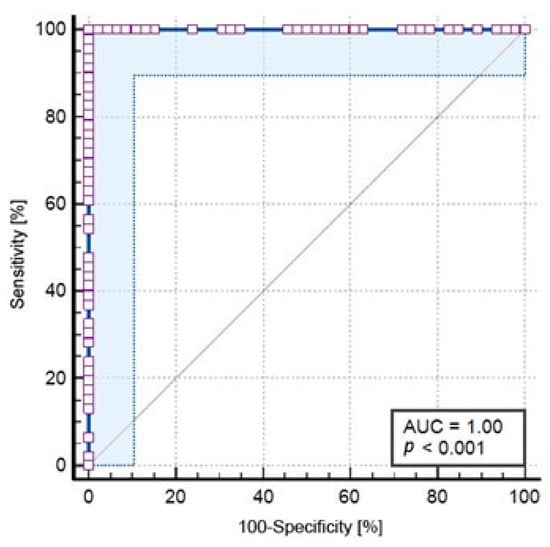 Serum LRG1 values were completely separated between groups, i.e., there was no overlap between LRG1 values measured in the acute appendicitis group and controls. Consequently, both AUC and Youlden’s index J values for this variable were maximal: 1.0 (95% CI 0.96–1.0) i.e., 1.0 (95% CI > 0.99–1.0) (Figure 1).