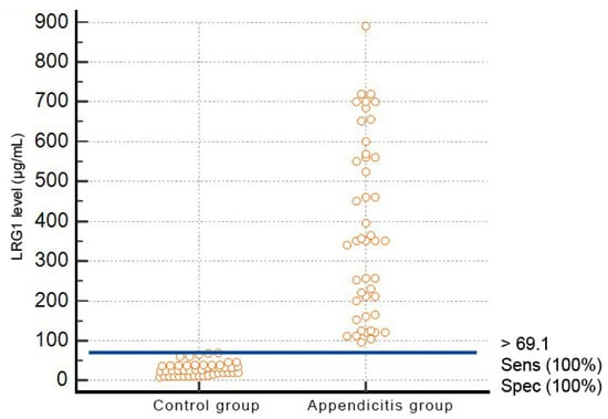 One hundred percent accurate separation of acute appendicitis vs. non-appendicitic cases based on the >69.1 µg/mL cut-off for LRG1 levels.