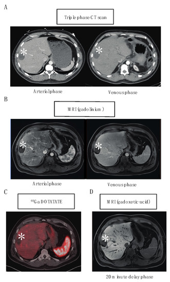 - Haider, M.; Jiang, B.G.; Parker, J.A.; Bullock, A.J.; Goehler, A.; Tsai, L.L. Use of MRI and Ga-68 DOTATATE for the detection of neuroendocrine liver metastases. Abdom. Imaging 2021, 47, 586–595. [Google Scholar] [CrossRef]