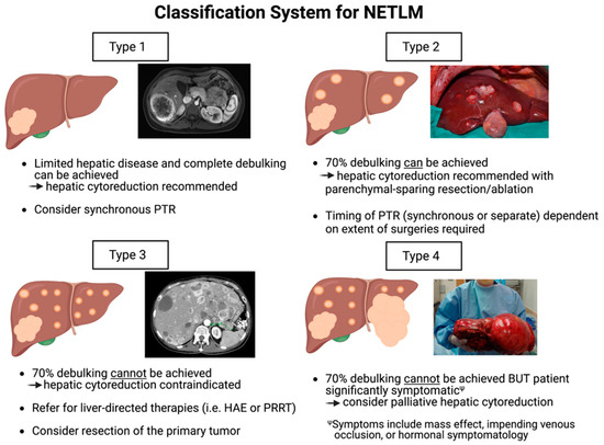 - Type 1: Patients of this category have a limited number of NETLMs that can be completely cleared with hepatic debulking. Depending on the degree of hepatic resection, synchronous PTR can be performed at the time of hepatic cytoreduction as per surgeon discretion.