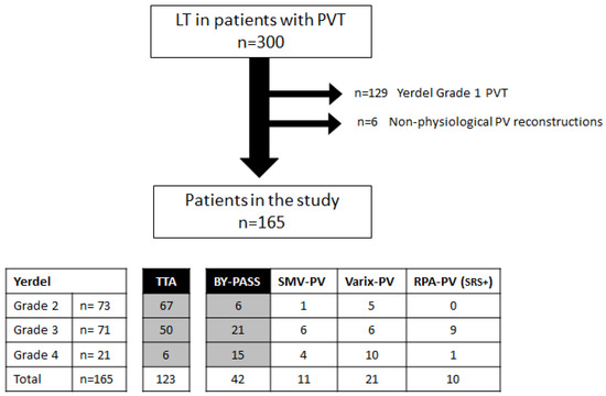 From January 2000 to December 2020, 300 adult patients with non-tumoral portal vein thrombosis underwent deceased-donor liver transplantations in the two aforementioned centres. Almost half of them were excluded from our analysis due to low-grade Yerdel 1 thrombosis (n = 129) or the adoption of a non-physiological portal vein reconstruction (n = 6); the remaining 165 patients were considered for this study. The diagram flow in Figure 2 shows the steps of patient exclusion and the distribution according to the Yerdel grade of PVT.