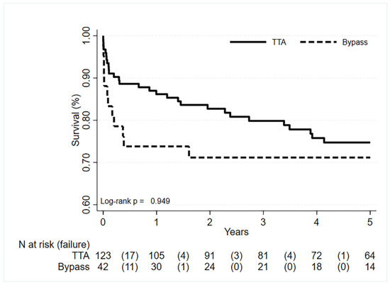 Figure 3 displays the Kaplan–Maier survival curves. The overall survival at 5 years for the entire population under study was 74%, ranging from 71% for the bypass group to 75% for the TTA group. This difference was not statistically different (p = 0.949). The majority of events in the bypass group occurred within the first 6 months, while they were more equally distributed over the study period in the TTA group.