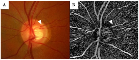 Fundus imaging (A) and optical coherence tomography angiography (OCTA) (B) in a 51-year-old male primary open-angle glaucoma patient show a cilioretinal artery (arrowhead) at the temporal rim of the optic nerve head without a connection with the central retinal artery.