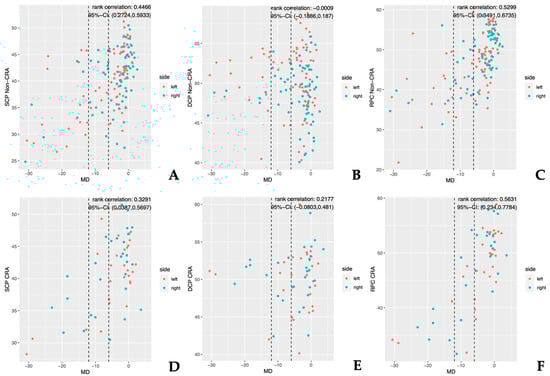 The results of the correlation analysis between the FD values (y-axis) and MD (x-axis) for the entire study population. Glaucoma severity was defined by the MD values. Groups 1 (MD ≥ −6), 2 (MD < −6 ≥ −12), and 3 (MD < −12) are distinguished by dotted lines. Three sectors, which are representative of the results in their respective locations, are each displayed for the CRA and non-CRA eyes. (A–C) Correlation between the superficial (A), deep (B), and peripapillary (C) FD and MD for the non-CRA eyes; (D–F) correlation between the superficial (D), deep (E), and peripapillary (F) FD and MD for the CRA eyes. MD = mean deviation; SCP = superficial capillary plexus; DCP = deep capillary plexus; RPC = radial peripapillary capillaries; CRA = cilioretinal artery.