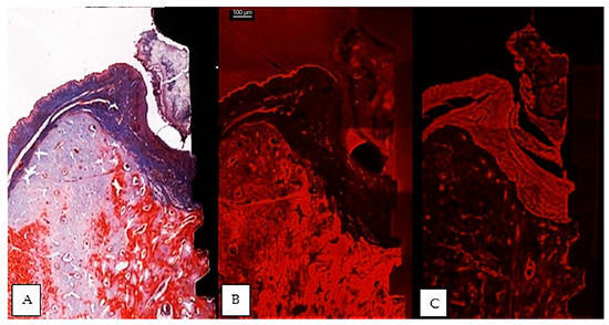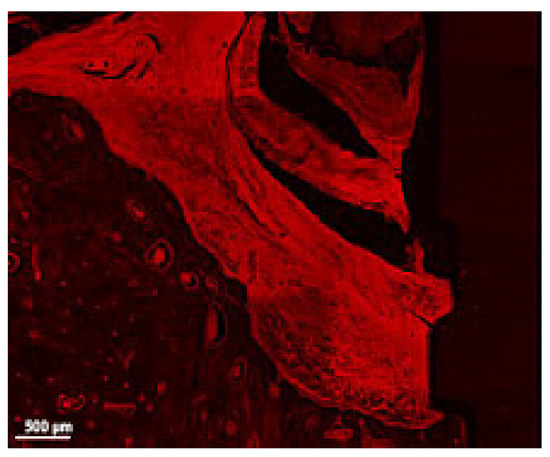 Human bones exhibit fluorescence, typically induced by natural antibiotics that are absorbed by collagen, and provide secondary, exogenous fluorophores. However, primary natural fluorescence (or autofluorescence) caused by enigmatic endogenous fluorophores is also present as a micro—phenomenon, whose nature is still obscure [61]. Collagen fibers in unmineralized osteoid appear to have pronounced autofluorescence [31]. While experimentally injected fluorescent substances are used for the study of hard tissue mineralization and bone aposition/regeneration, autofluorescence seems useful for the study of bone destructive processes, like in the present study of experimental peri-implantitis.