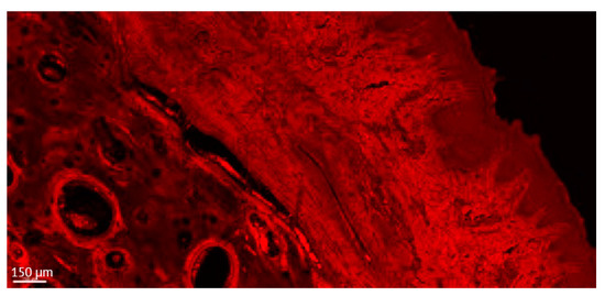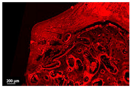 Developed relatively recently, the confocal laser scanning microscope (CLSM) focuses only on a single focal plane, and the unfocused plane remains unvisualized. The technique utilizes a laser beam, which penetrates tissue to a depth of 300–500 μm and thus reflects images beneath the surface of a specimen [31,32,33]. In the past, the traditional fluorescent microscopes excited the whole thickness of the sample, resulting in saturated, blurry images and sometimes visualizing false colocalization images [34]. Since the CLSM excites a single focal plane, this technique is suitable for quantification and visualizing “true” images. CLSM allows modulation of the intensity of the signal and the microscope can pick up the weakest signals expressed in the sections as autofluorescence, especially useful for the study of bone destructive processes [35].