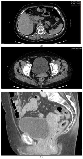 (a) Preoperative CT cross-section at the liver level, free of pathological lesions. (b,c) Multilocular solid left adnexal mass, recurrence of HCC, seen in sagittal and transverse scans.