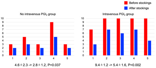 Before compression stockings, the NRS score showed 10 (worst score) in four patients in intravenous PGI2 group. Compression stockings significantly improved NRS score in both groups, where NRS score was significantly improved from 4.6 ± 2.3 to 2.8 ± 1.2 (p = 0.037) in no intravenous PGI2 group and from 9.4 ± 1.2 to 5.4 ± 1.6 (p = 0.002) in intravenous PGI2 group (Figure 1).