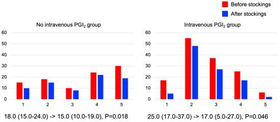 The PDAS score also showed similar results (Figure 2). In both groups, PDAS score was significantly improved [no intravenous PGI2 group; 18.0 (15.0–24.0) to 15.0 (10.0–19.0), p = 0.018, intravenous PGI2 group; 25.0 (17.0–37.0) to 17.0 (5.0–27.0), p = 0.046]. In terms of the specific comments of the PDAS, all five subjects in no intravenous PGI2 group showed difficulty in performing “chores such as vacuuming and gardening”, “carrying heavy stuffs”, and “walking on level ground”, and four patients improved in the difficulty of “walking on a level ground” after compression stockings. In the intravenous PGI2 group, all five patients felt difficulty in the following items: “going out for shopping”, “going up and down stairs”, “carrying heavy stuffs”, and “walking on level ground”. After compression stockings, all five patients improved in “going out for shopping” and “walking on level ground”, and four of them improved in “going up and down stairs”.