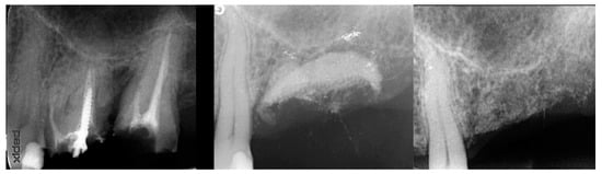 The consent form was reviewed with the patient and then signed. Local anesthetic was administered into the buccal vestibule adjacent to the molars to be treated. The two molars were atraumatically extracted, and the sockets were curetted to remove any residual tissue. The EthOss graft material syringe was held vertically and per the manufacturer’s instructions, sterile saline was added to the syringe to wet the graft material. Once the saline had wetted the graft material, the end cap was removed from the syringe and a piece of dry gauze was utilized to remove any excess saline. The syringe was then carried to the intraoral site and expressed into the sockets. The material was gently compressed to shape it to fill the void being grafted with sterile gauze for 3 min at which stage it began to harden, showing resistance to pressure and being firm to touch. The flap margins were then closed to achieve primary closure and secured with 5–0 PGA sutured in an interrupted fashion. A periapical radiograph was obtained to document the socket grafting (Figure 1, middle).