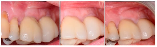 Soft tissue at placement of the restoration on the 2nd molar (left), at 1 year post-restoration (middle) and at 2 years post-restoration (right) demonstrating maintenance of the keratinized tissue long term.