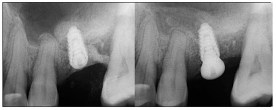 A 74-year-old female patient presented with failing maxillary left 1st and 2nd molars. Examination noted grade 2 mobility on both molars. Radiographically significant periodontal bone loss was noted on the molars, and they were deemed non-salvageable (Figure 8, left). The patient was informed and the recommended treatment would require multi-staging with grafting to allow implants to be placed at both molar sites. Extraction consent forms were signed, and local anesthetic was administered. The two mobile molars were atraumatically extracted, and the sockets were curetted. The site would be allowed to heal and achieve primary soft tissue closure before the initial grafting and initiation of implant placement. The patient accepted and was appointed to return in 10 weeks.