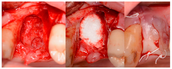 Delayed socket grafting with flap exposure of the site (left), placement of EthOss graft to fill the defect (middle) and flap placement to achieve primary closure (right).