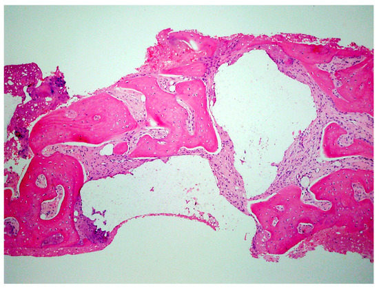 Histology of the core sample obtained following 10 weeks of graft site healing demonstrating well preserved reactive (woven) trabecular bone with intertrabecular tissue composed of uniformly collagen-rich myofibroblastic tissue and 60% of the core consisting of bone.