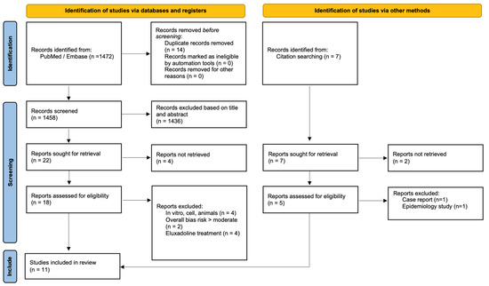 A total of 1472 relevant articles were identified through the systematic literature search and 7 articles were found during subsequent chain searching. After screening of title and abstract, 23 articles were left for full text screening, 11 of which were included in this review (Figure 1).