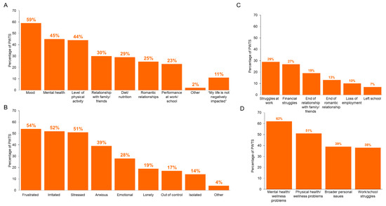 PPWTS reported consequences due to trouble sleeping/insomnia. PWTS reported (A) aspects of life negatively impacted by trouble sleeping/insomnia, (B) emotions due to trouble sleeping/insomnia, and (C) experiences due to trouble sleeping/insomnia. (D) A proportion of PWTS believes their life challenges are due to their trouble sleeping/insomnia. PWTS, people with trouble sleeping.