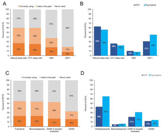 Use of prescription sleep medication and nonprescription treatment reported by PWTS and how often they are recommended by HCPs. (A) Use of natural sleep aids, OTC sleep aids, CBD, and CBT-I in PWTS who have ever used a prescription sleep medication and (B) percentage of PCPs/psychiatrists who always (or always)/often recommend nonprescription treatments. (C) Use of trazodone, benzodiazepines, GABA-A receptor modulators, and DORAs in PWTS who have ever used a prescription sleep medication and (D) the percentage of PCPs/psychiatrists who always (or always)/often prescribe treatments. Due to rounding completed by the Harris Poll, percentages may add up to more than 100%. CBD, cannabidiol; CBT-I, cognitive behavioral therapy for insomnia; DORA, dual orexin receptor antagonist; GABA-A, γ-aminobutyric acid type A; HCP, health care professional; OTC, over the counter; PCP, primary care physician; PWTS, people with trouble sleeping.