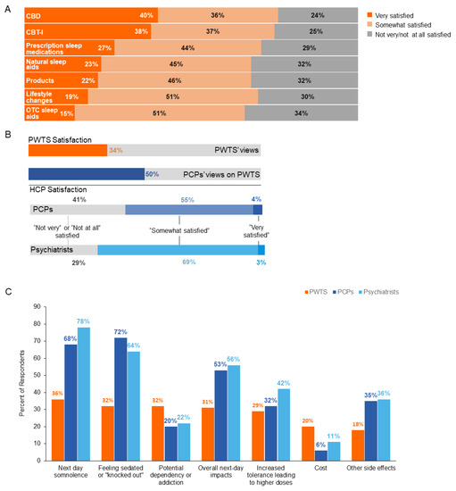 PWTS satisfaction with each treatment/solution currently being used, overall satisfaction with current pharmacologic treatment options, and the top concerns about OTC sleep aids for trouble sleeping/insomnia for PWTS, PCPs, and psychiatrists. (A) PWTS reported satisfaction with their current treatment. (B) PWTS overall satisfaction with current pharmacologic treatments, PCPs’ views on PWTS satisfaction, and HCP overall satisfaction. (C) Top concerns of PWTS, PCPs, and psychiatrists about OTC sleep aids for trouble sleeping/insomnia. CBD, cannabidiol; HCP, health care professional; OTC, over the counter; PCP, primary care physician; PWTS, people with trouble sleeping.