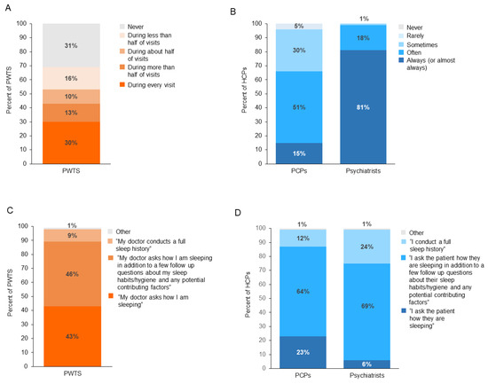 Additionally, PWTS reported that even when their PCP did ask about sleep, a full sleep history (defined as asking about sleep patterns, daytime sleepiness, sleep quality, and sleep history over time) was rarely (9%) conducted (Figure 4C); but when physicians were asked about how they conduct discussions with their patients about sleep, 12% of PCPs claimed that they do conduct full sleep histories during routine visits (as did 24% of psychiatrists) (Figure 4D).