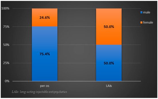 Among the clinical and demographic variables that have been examined in the present study, only female gender is statistically significantly associated with LAI use. This does not necessarily mean that female patients in this study have a more positive attitude toward LAIs or that they are more frequently eligible for such treatment, but another interpretation could be that women would be more easily forced by caregivers to accept such treatment to address poor adherence. There is evidence that female patients with schizophrenia are commonly amenable to domestic coercion and control [47,48], and this could be the case with the female patients in the present sample. This finding is clinically relevant, as recent research has suggested that female gender may pose a higher risk of antipsychotic treatment non-adherence [10]. However, in a very recent study of an inpatient ward in Switzerland, male gender was associated with LAI prescription [30]. Additionally, this finding may have clinical implications. It has been previously shown that in the region investigated in our study, male gender is mostly associated with involuntary admission status [49] and with the subsequent application of coercive physical measures during hospitalization [50]. Subsequently, several of those admissions and their adverse consequences would have been avoided if more male patients had been prescribed an LAI regimen. Accordingly, interventions for male patients are needed if we are to increase LAI use in those patients.