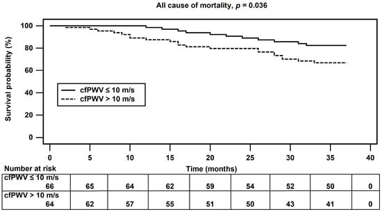 Patient conditions were monitored for 36 months until 30 June 2017 during follow-up visits at the HD room and based on medical records. The study endpoint was all-cause mortality. The causes of mortality were hemorrhagic stroke (n = 7), ischemic stroke (n = 10), acute myocardial infarction (n = 5), and septic shock (n = 5). CV mortality comprised hemorrhagic stroke, ischemic stroke, or acute myocardial infarction. Event-free survival was defined as the interval between cfPWV evaluation and death or the end of study follow-up.