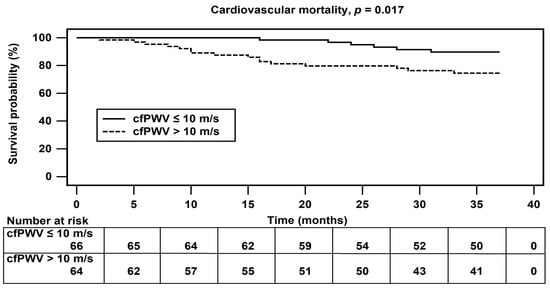 Compared with patients who survived, those who died from CV causes had significantly higher levels of cfPWV (p < 0.001), lower serum creatinine (p = 0.020), and higher prevalence of DM (p = 0.001) (Table 4). On multivariate Cox regression analysis with adjustment for prognostic variables, increased cfPWV level was significantly associated with CV death (Cox Model 3, HR 1.317, 95% CI 1.13–1.534; p < 0.001) (Table 5). The Kaplan–Meier plot in Figure 2 illustrates that an elevated cfPWV of >10 m/s was associated with increased CV mortality in HD patients (p = 0.017).