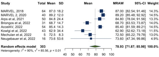 Forest plot of the atrioventricular synchrony proportion (%) [6,7,8,9,10,14,15,16].