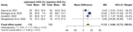 Additionally, 4 studies [8,10,14,15] also explored the impact of manually optimized reprogramming on atrioventricular synchrony, compromising a total of 112 patients. A meta-analysis was conducted, with the efficacy outcome measured as the mean difference between baseline and post-programming atrioventricular synchrony. The results showed a statistically significant increase in atrioventricular synchrony by 11.3% (95% CI 7.0–15.7%; p < 0.01) in patients who underwent programming optimization (Figure 3). There was low heterogeneity between studies (I2 = 13%, p = 0.33).