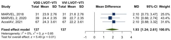 Three studies involved one hundred thirty-seven patients who underwent echocardiogram procedures to assess the impact of leadless atrioventricular synchronous pacing on LVOT-VTI. All patients had a complete atrioventricular block and normal sinus function. Paired LVOT-VTI was obtained from echocardiograms, with the algorithm programmed to the VVI mode and VDD mode. A meta-analysis was undertaken to compare the changes in LVOT-VTI between the two pacing modes. It was found that leadless atrioventricular synchronous pacing could significantly increase the LVOT-VTI by 1.9 cm (95%CI 1.2–2.6, p < 0.01), without any heterogeneity observed across these studies (I2 = 0%, p = 0.85) (Figure 4).