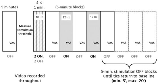 The following supporting information can be downloaded at: https://www.mdpi.com/article/10.3390/jcm12072514/s1: Section S1. Clinical Global Impression–Efficacy Index (participant); Section S2. Comments on improvement with stimulation from visit debriefing; Figure S1. Tic frequency before and after stimulation ends; Section S3. CONSORT 2010 checklist of information to include when reporting a randomised trial; Table S1. Items to include when reporting a randomised crossover trial in a journal abstract. Videos from selected participants appear at https://zenodo.org/record/7651755 (DOI: 10.5281/zenodo.7651755).