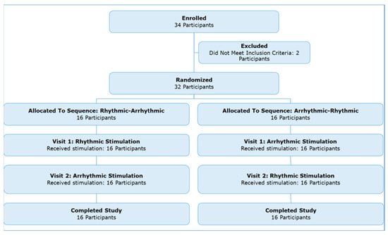 Thirty-two participants enrolled in this study and completed both visit 1 and visit 2 (Figure 2). Half had rhythmic MNS on the first visit, and the other half arrhythmic. One participant ended one visit early due to discomfort after the first 5-min active MNS block on the arrhythmic day; all other visits were completed in full, requiring a makeup visit in four cases. One participant’s two visits occurred only 1 day apart; all others’ two visits were separated by at least a week. The video recordings after baseline were lost from one participant’s arrhythmic MNS visit, so n = 31 for analyses of tic frequency and intensity with arrhythmic stimulation.