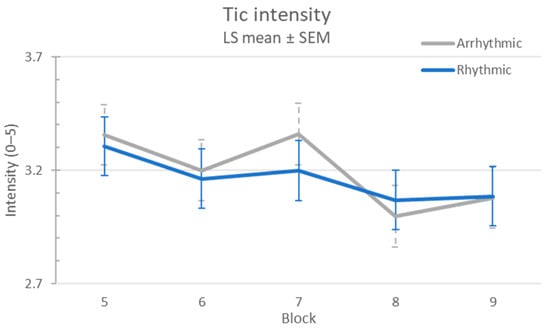 Each occurrence of every tic during the last 40 s of on vs. off 1-min stimulation epochs on the rhythmic MNS day was scored by the blinded rater using the intensity item from the Yale Global Tic Severity Scale (YGTSS), which uses integer scores from 0 (no tics) to 5 (severe). The number of tics (tic frequency) and the mean of the intensity ratings in each block (tic intensity) comprised the dependent variables. This sample design replicated that of Study 3 from Morera Maiquez et al. (2020) [6], though our analysis differed. We log transformed tic count to stabilize variance. We analyzed log tic count and mean tic intensity with a random effect repeated-measures model in which the subject was random, and the correlation within subjects was modeled with a compound symmetry covariance structure. Fixed effects were baseline measure (Block 0), block (Block 1, 2, 3, or 4), stimulation (on, off), stimulation lag (1 for blocks preceded by a block with active stimulation and 0 otherwise), and stimulation lag by stimulation interaction. The lag variable was added to the protocol-specified analysis to test for the persistence of an effect in consecutive blocks.